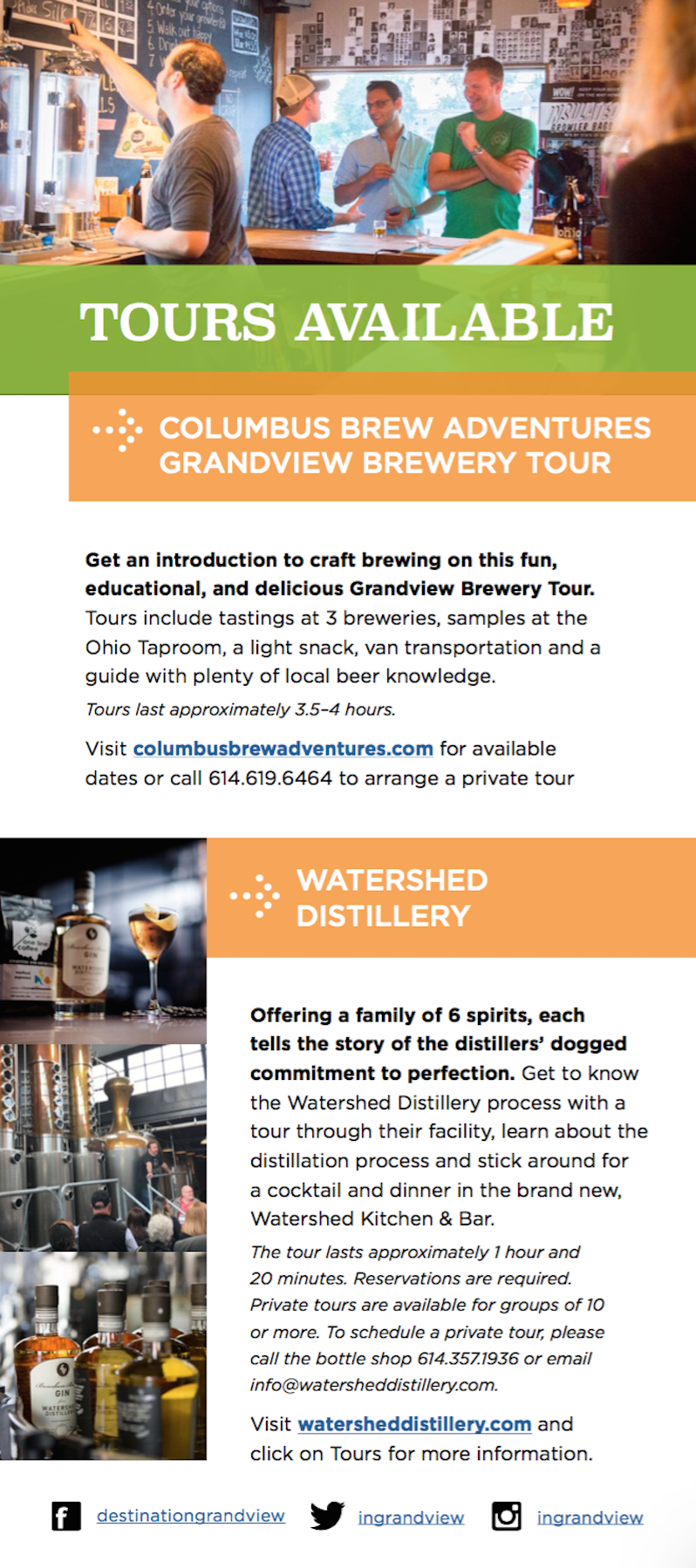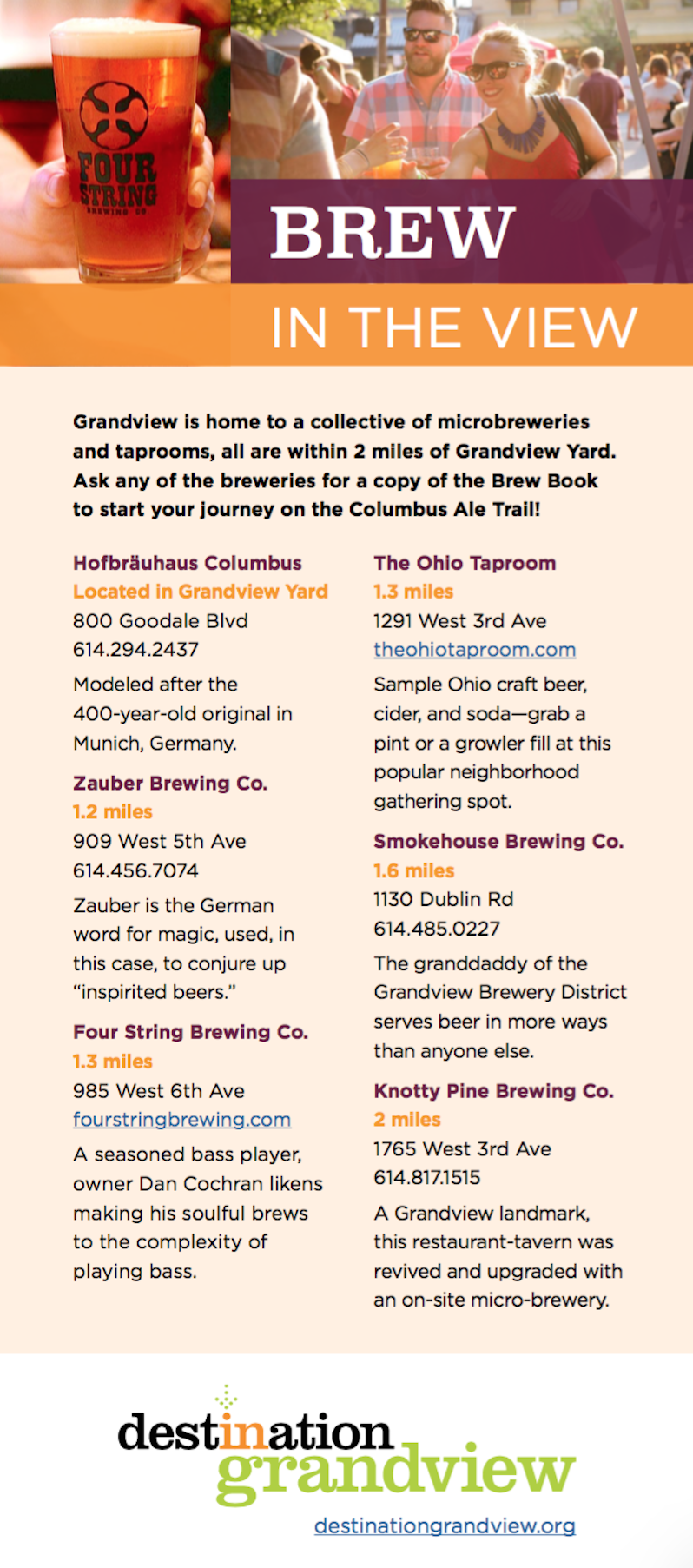 There’s plenty to “brew” in Grandview so we’ve created a new pocket guide to the breweries and taprooms in our neighborhood! Download the directory here or pick one up at the Destination Grandview office inside the Grand Event Center or find a copy in the lobbies at our Grandview hotels
